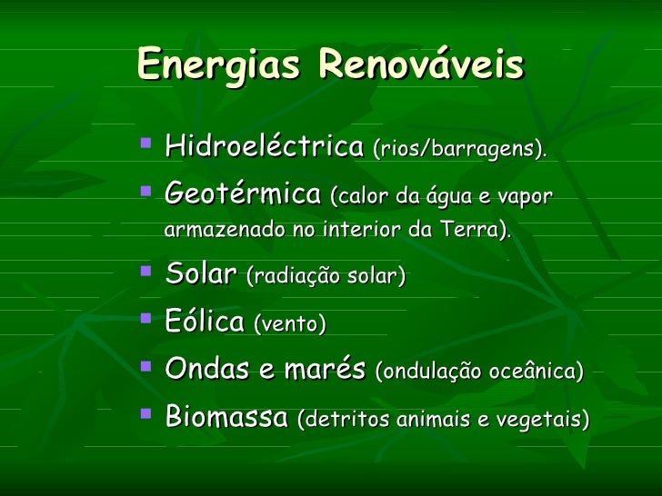 Energias Renováveis   Hidroeléctrica (rios/barragens).   Geotérmica (calor da água e vapor    armazenado no interior da ...