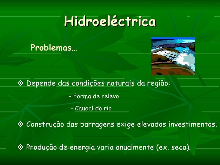 Hidroeléctrica   Problemas… Depende das condições naturais da região:              - Forma de relevo               - Caud...