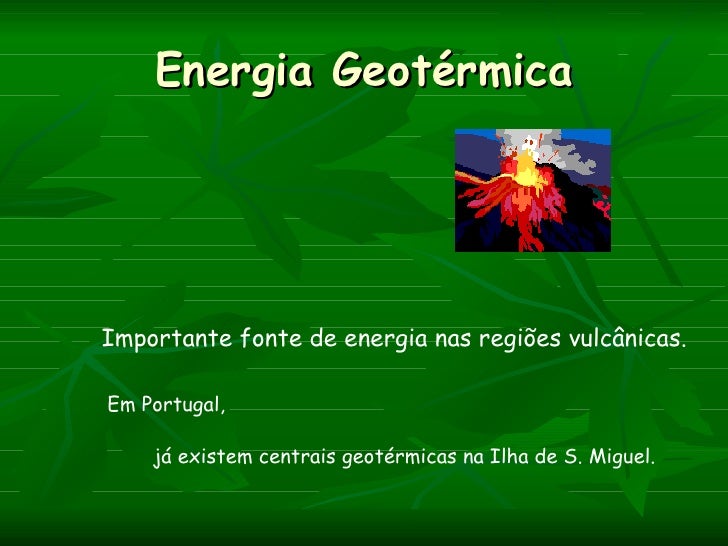 Energia GeotérmicaImportante fonte de energia nas regiões vulcânicas.Em Portugal,    já existem centrais geotérmicas na Il...