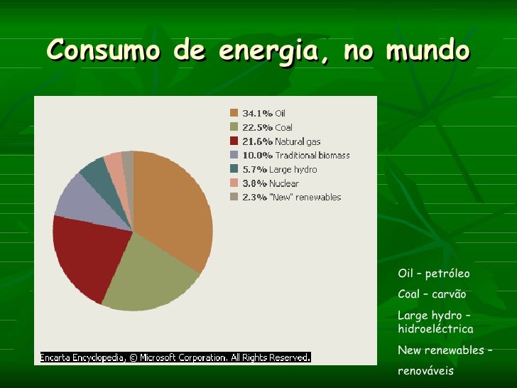 1. 1. Consumo de energia, no mundo Oil – petróleo Coal – carvão Large hydro – hidroeléctrica New renewables – renováveis