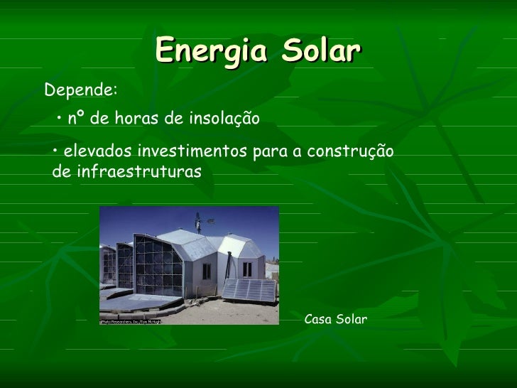 Energia SolarDepende: • nº de horas de insolação• elevados investimentos para a construçãode infraestruturas              ...
