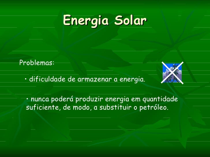 Energia SolarProblemas: • dificuldade de armazenar a energia. • nunca poderá produzir energia em quantidade suficiente, de...
