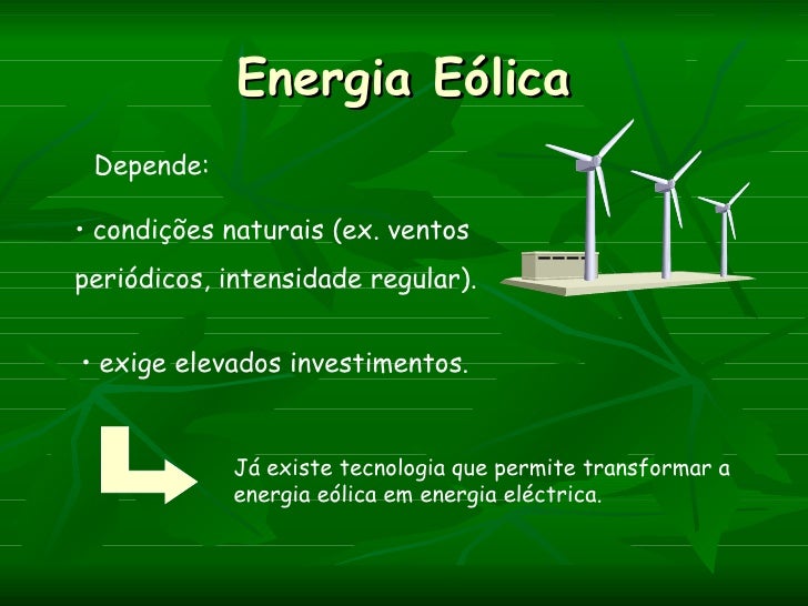 Energia Eólica Depende:• condições naturais (ex. ventosperiódicos, intensidade regular).• exige elevados investimentos.   ...