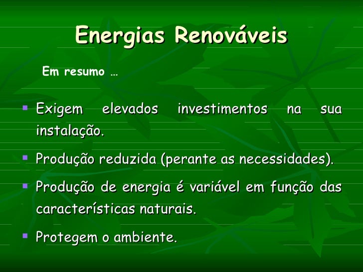 Energias Renováveis    Em resumo …   Exigem elevados      investimentos   na   sua    instalação.   Produção reduzida (p...