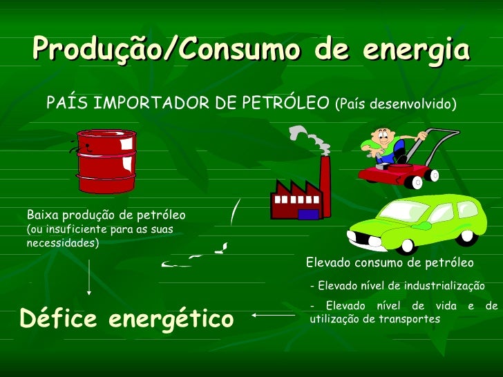 Produção/Consumo de energia   PAÍS IMPORTADOR DE PETRÓLEO (País desenvolvido)Baixa produção de petróleo(ou insuficiente pa...