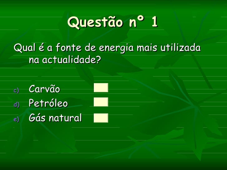 Questão nº 1Qual é a fonte de energia mais utilizada  na actualidade?c)   Carvãod)   Petróleoe)   Gás natural