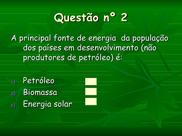 Questão nº 2A principal fonte de energia da população   dos países em desenvolvimento (não   produtores de petróleo) é:c) ...