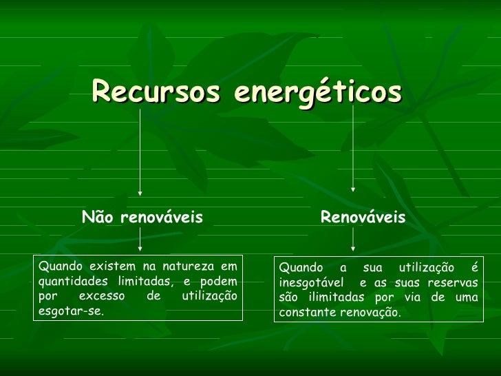 Recursos energéticos       Não renováveis                     RenováveisQuando existem na natureza em       Quando a sua u...