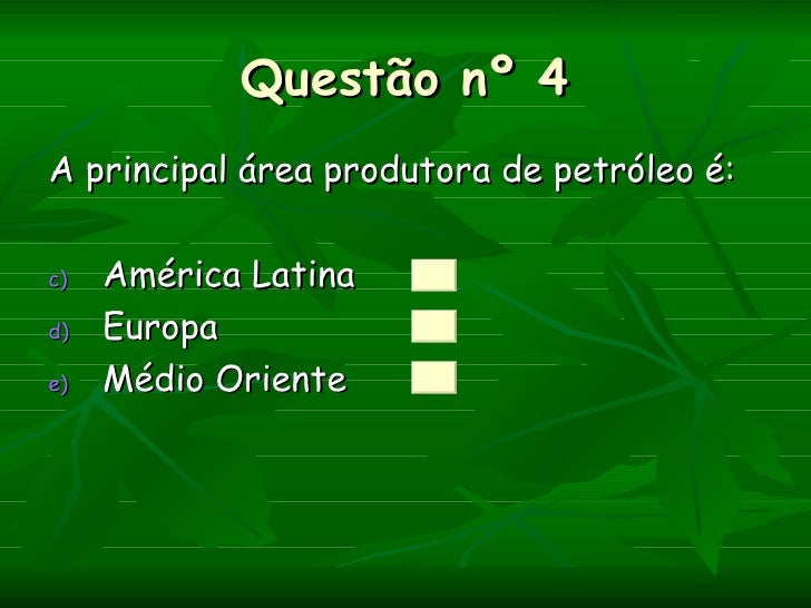 Questão nº 4A principal área produtora de petróleo é:c)   América Latinad)   Europae)   Médio Oriente