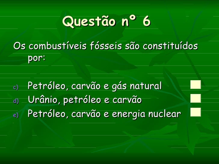 Questão nº 6Os combustíveis fósseis são constituídos   por:c)   Petróleo, carvão e gás naturald)   Urânio, petróleo e carv...