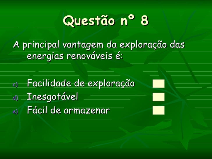 Questão nº 8A principal vantagem da exploração das   energias renováveis é:c)   Facilidade de exploraçãod)   Inesgotávele)...