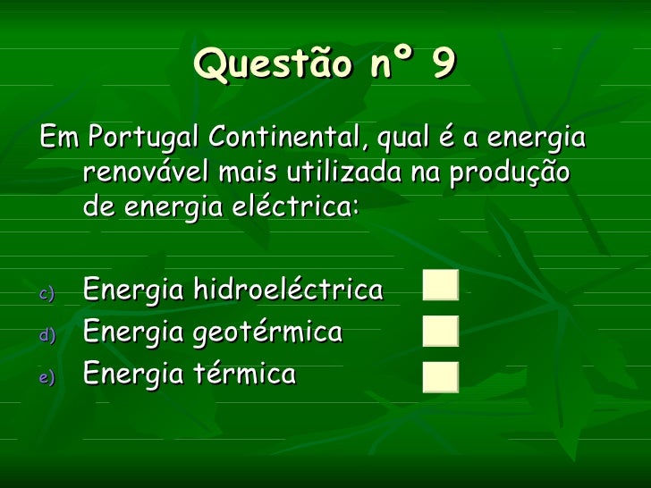 Questão nº 9Em Portugal Continental, qual é a energia  renovável mais utilizada na produção  de energia eléctrica:c)   Ene...