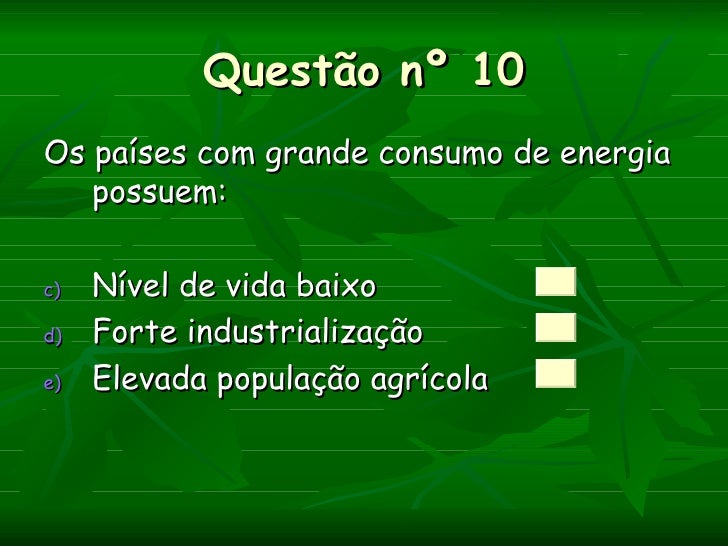 Questão nº 10Os países com grande consumo de energia   possuem:c)   Nível de vida baixod)   Forte industrializaçãoe)   Ele...