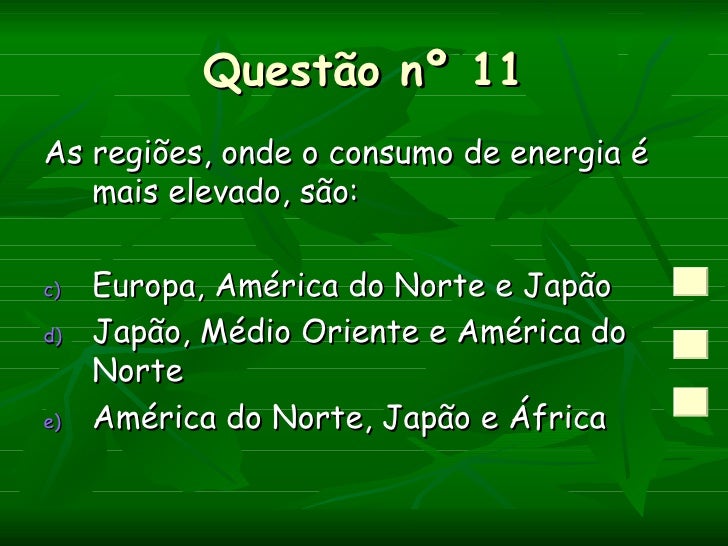 Questão nº 11As regiões, onde o consumo de energia é   mais elevado, são:c)   Europa, América do Norte e Japãod)   Japão, ...