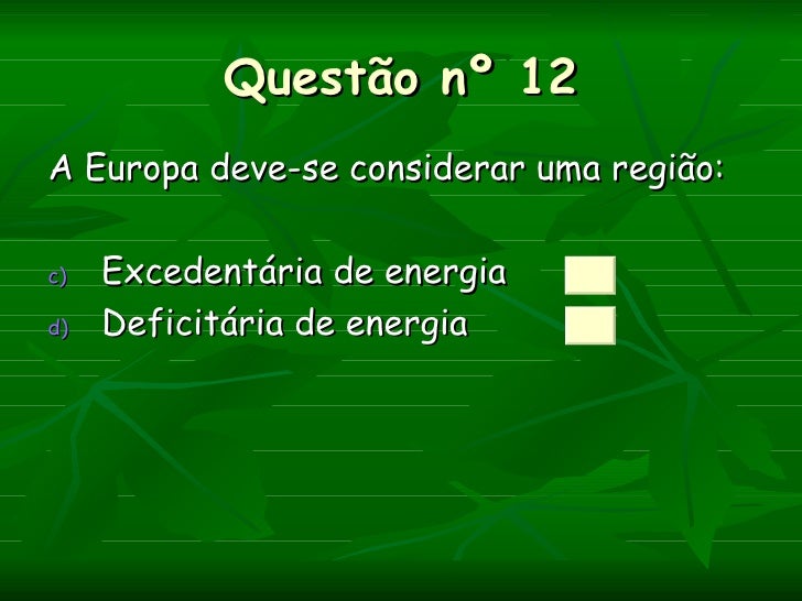 Questão nº 12A Europa deve-se considerar uma região:c)   Excedentária de energiad)   Deficitária de energia