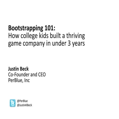 1. 1. Bootstrapping 101: How college kids built a thriving game company in under 3 years Justin Beck Co-Founder and CEO PerBlue, Inc @PerBlue @JustinKBeck
