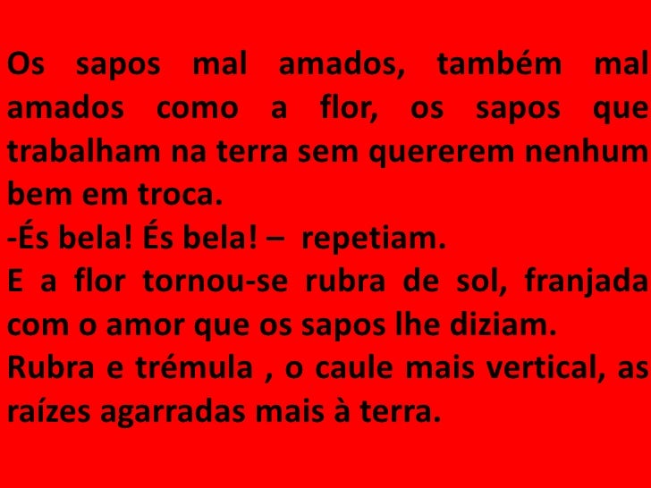 5. 5. Os sapos mal amados, também malamados como a flor, os sapos quetrabalham na terra sem quererem nenhumbem em troca.-És bela! És bela! – repetiam.E a flor tornou-se rubra de sol, franjadacom o amor que os sapos lhe diziam.Rubra e trémula , o caule mais vertical, asraízes agarradas mais à terra.