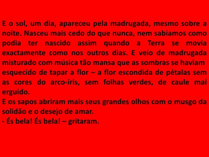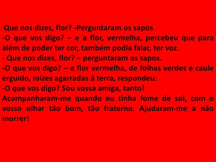 6. 6. -Que nos dizes, flor? -Perguntaram os sapos-O que vos digo? – e a flor, vermelha, percebeu que paraalém de poder ter cor, também podia falar, ter voz.- Que nos dizes, flor? – perguntaram os sapos.-O que vos digo? – e flor vermelha, de folhas verdes e cauleerguido, raízes agarradas á terra, respondeu:-O que vos digo? Sou vossa amiga, tanto!Acompanharam-me quando eu tinha fome de sol, com ovosso olhar tão bom, tão fraterno. Ajudaram-me a nãomorrer!