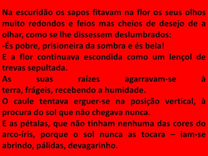 2. 2. Na escuridão os sapos fitavam na flor os seus olhosmuito redondos e feios mas cheios de desejo de aolhar, como se lhe dissessem deslumbrados:-És pobre, prisioneira da sombra e és bela!E a flor continuava escondida como um lençol detrevas sepultada.As suas raízes agarravam-se àterra, frágeis, recebendo a humidade.O caule tentava erguer-se na posição vertical, àprocura do sol que não chegava nunca.E as pétalas, que não tinham nenhuma das cores doarco-íris, porque o sol nunca as tocara – iam-seabrindo, pálidas, devagarinho.