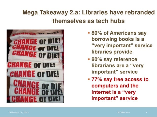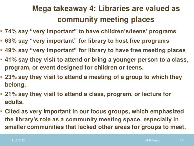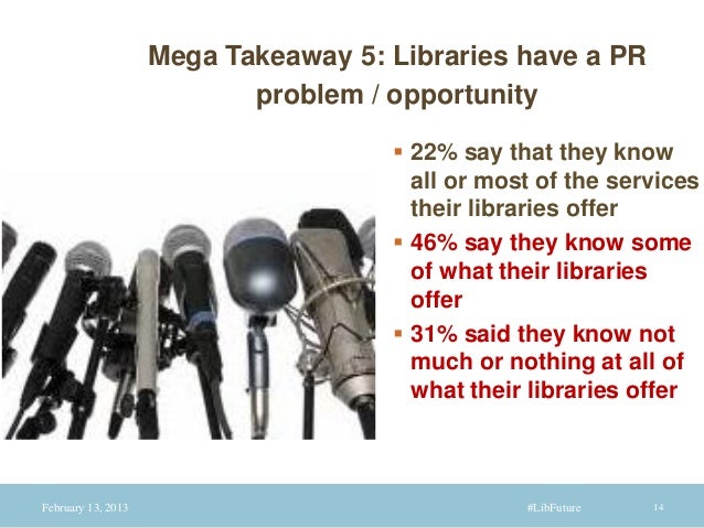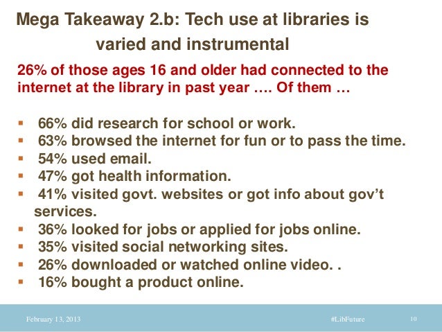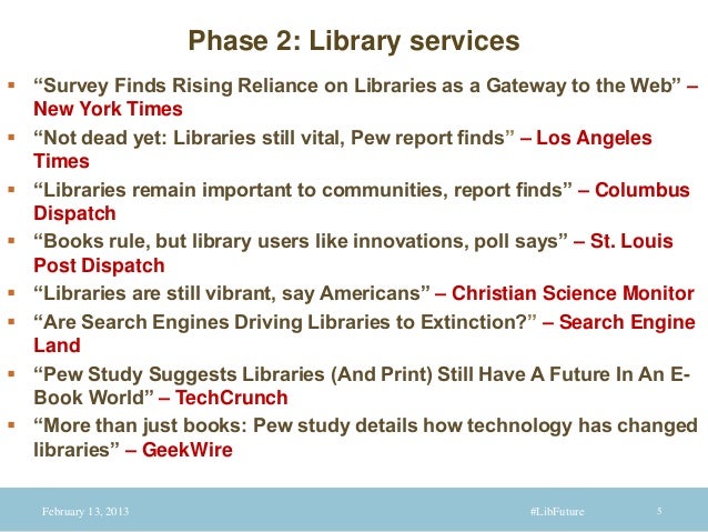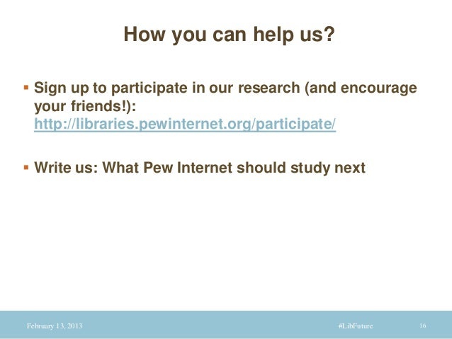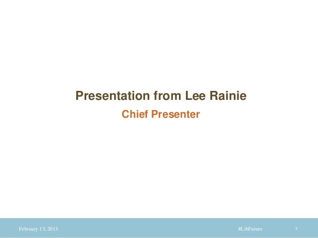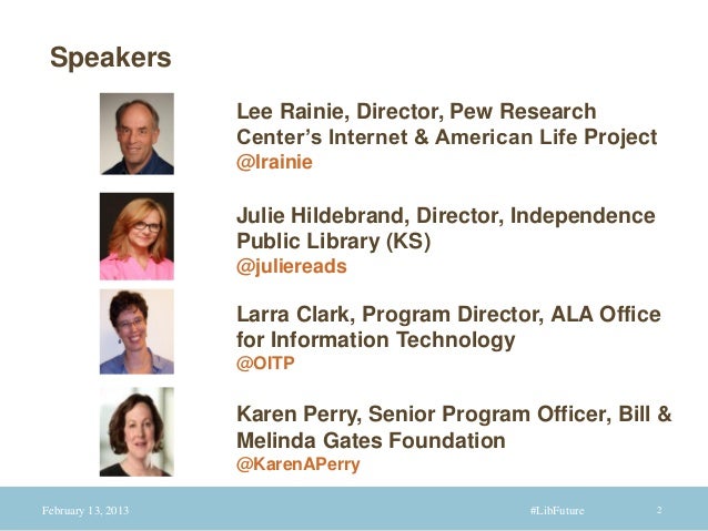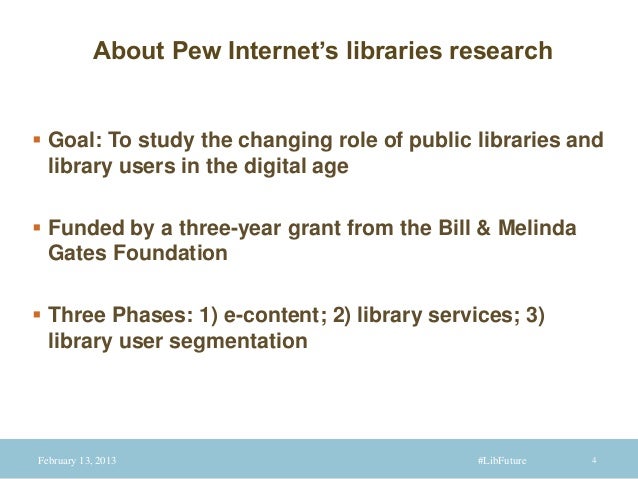 Lee Rainie, Director of the Pew Research Center’s Internet & American Life Project, was joined by digital and library experts to discuss the findings of the Project’s most recent report, "Library Services in the Digital Age." The report is based on the findings of a nationally representative survey that asked Americans what types of services they value in their library and what types of services they would like to see their library start to offer. More information, including slides from other presenters, are available at: http://www.webjunction.org/events/webjunction/Libraries_can_meet_the_Evolving_Needs_of_Patrons_in_Digital_Age.html