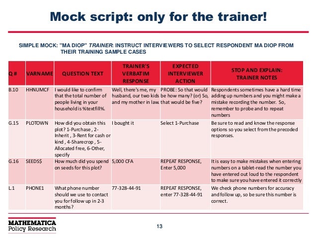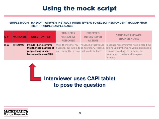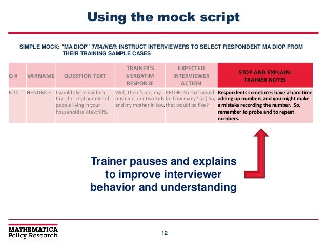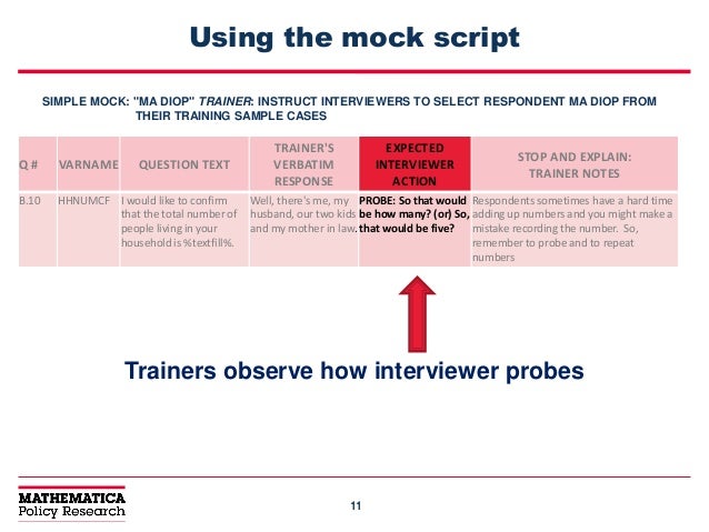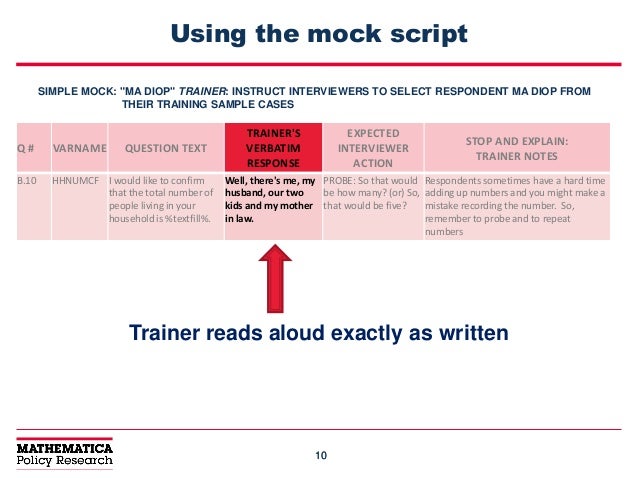 10. 10. 1010 Using the mock script SIMPLE MOCK: "MA DIOP" TRAINER: INSTRUCT INTERVIEWERS TO SELECT RESPONDENT MA DIOP FROM THEIR TRAINING SAMPLE CASES Q # VARNAME QUESTION TEXT TRAINER'S VERBATIM RESPONSE EXPECTED INTERVIEWER ACTION STOP AND EXPLAIN: TRAINER NOTES B.10 HHNUMCF I would like to confirm that the total number of people living in your household is %textfill%. Well, there's me, my husband, our two kids and my mother in law. PROBE: So that would be how many? (or) So, that would be five? Respondents sometimes have a hard time adding up numbers and you might make a mistake recording the number. So, remember to probe and to repeat numbers Trainer reads aloud exactly as written