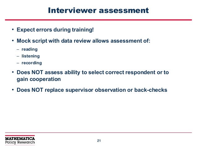 21. 21. 2121 Interviewer assessment • Expect errors during training! • Mock script with data review allows assessment of: – reading – listening – recording • Does NOT assess ability to select correct respondent or to gain cooperation • Does NOT replace supervisor observation or back-checks
