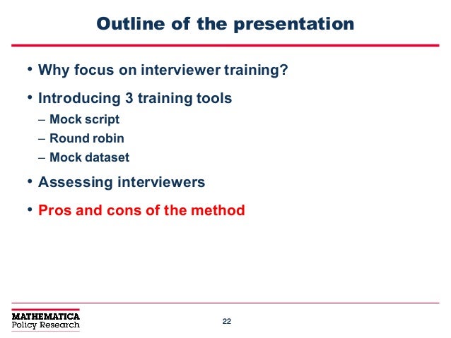 22. 22. 2222 Outline of the presentation • Why focus on interviewer training? • Introducing 3 training tools – Mock script – Round robin – Mock dataset • Assessing interviewers • Pros and cons of the method