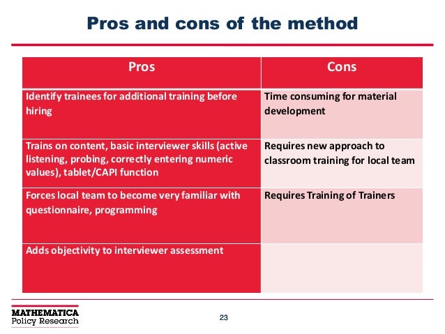 23. 23. 2323 Pros and cons of the method Pros Cons Identify trainees for additional training before hiring Time consuming for material development Trains on content, basic interviewer skills (active listening, probing, correctly entering numeric values), tablet/CAPI function Requires new approach to classroom training for local team Forces local team to become very familiar with questionnaire, programming Requires Training of Trainers Adds objectivity to interviewer assessment