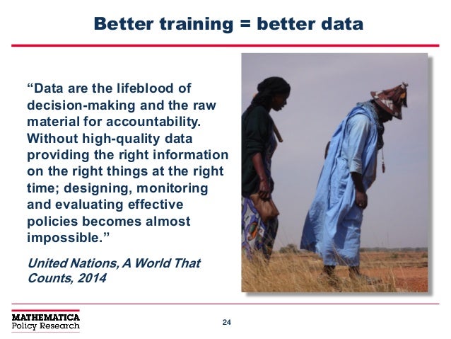 24. 24. 2424 Better training = better data “Data are the lifeblood of decision-making and the raw material for accountability. Without high-quality data providing the right information on the right things at the right time; designing, monitoring and evaluating effective policies becomes almost impossible.” United Nations, A World That Counts, 2014