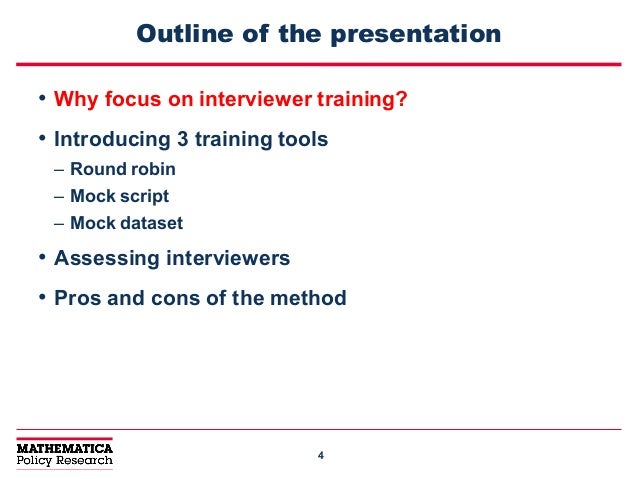 3. 3. 33 Outline of the presentation • Why focus on interviewer training? • Introducing 3 training tools – Round robin – Mock script – Mock dataset • Assessing interviewers • Pros and cons of the method
