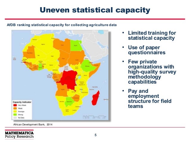 5. 5. 55 Uneven statistical capacity • Limited training for statistical capacity • Use of paper questionnaires • Few private organizations with high-quality survey methodology capabilities • Pay and employment structure for field teams AfDB ranking statistical capacity for collecting agriculture data African Development Bank, 2014