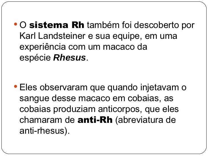 9. 9.  O sistema Rh também foi descoberto por Karl Landsteiner e sua equipe, em uma experiência com um macaco da espécie Rhesus. Eles observaram que quando injetavam o sangue desse macaco em cobaias, as cobaias produziam anticorpos, que eles chamaram de anti-Rh (abreviatura de anti-rhesus).