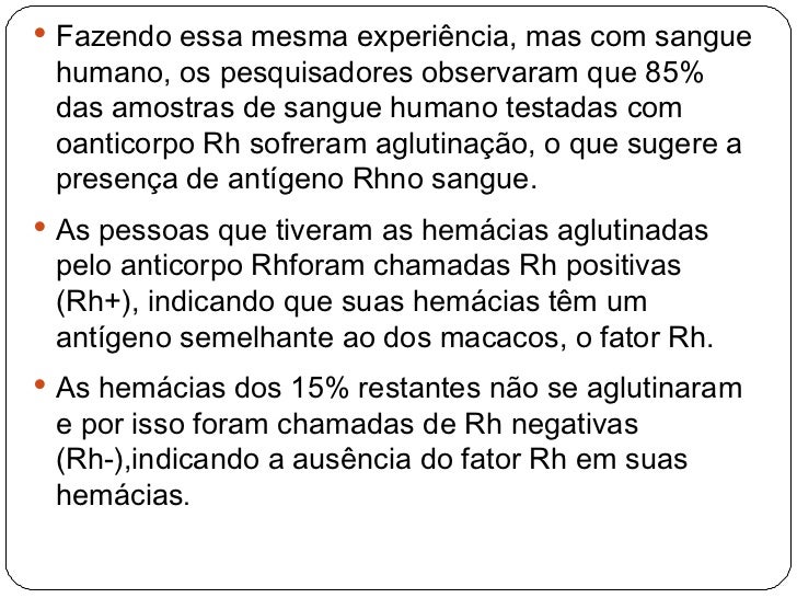 10. 10.  Fazendo essa mesma experiência, mas com sangue humano, os pesquisadores observaram que 85% das amostras de sangue humano testadas com oanticorpo Rh sofreram aglutinação, o que sugere a presença de antígeno Rhno sangue. As pessoas que tiveram as hemácias aglutinadas pelo anticorpo Rhforam chamadas Rh positivas (Rh+), indicando que suas hemácias têm um antígeno semelhante ao dos macacos, o fator Rh.  As hemácias dos 15% restantes não se aglutinaram e por isso foram chamadas de Rh negativas (Rh-),indicando a ausência do fator Rh em suas hemácias.