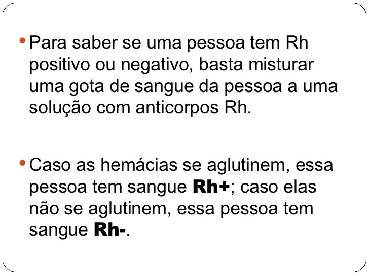 11. 11.  Para saber se uma pessoa tem Rh positivo ou negativo, basta misturar uma gota de sangue da pessoa a uma solução com anticorpos Rh. Caso as hemácias se aglutinem, essa pessoa tem sangue Rh+; caso elas não se aglutinem, essa pessoa tem sangue Rh-.