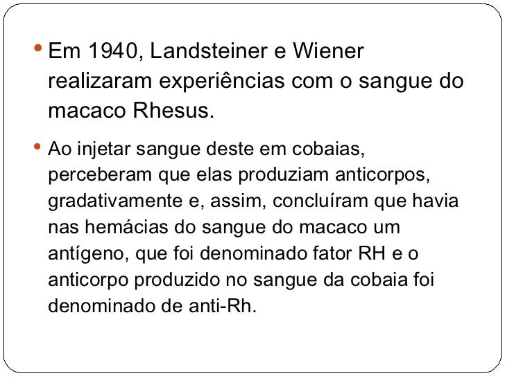 14. 14.  Em 1940, Landsteiner e Wiener realizaram experiências com o sangue do macaco Rhesus. Ao injetar sangue deste em cobaias, perceberam que elas produziam anticorpos, gradativamente e, assim, concluíram que havia nas hemácias do sangue do macaco um antígeno, que foi denominado fator RH e o anticorpo produzido no sangue da cobaia foi denominado de anti-Rh.