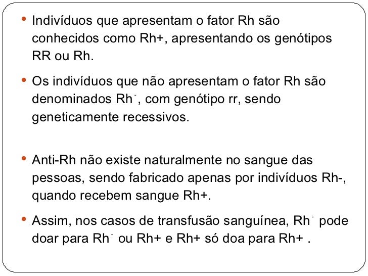15. 15.  Indivíduos que apresentam o fator Rh são conhecidos como Rh+, apresentando os genótipos RR ou Rh. Os indivíduos que não apresentam o fator Rh são denominados Rhֿ, com genótipo rr, sendo geneticamente recessivos. Anti-Rh não existe naturalmente no sangue das pessoas, sendo fabricado apenas por indivíduos Rh-, quando recebem sangue Rh+. Assim, nos casos de transfusão sanguínea, Rhֿ pode doar para Rhֿ ou Rh+ e Rh+ só doa para Rh+ .