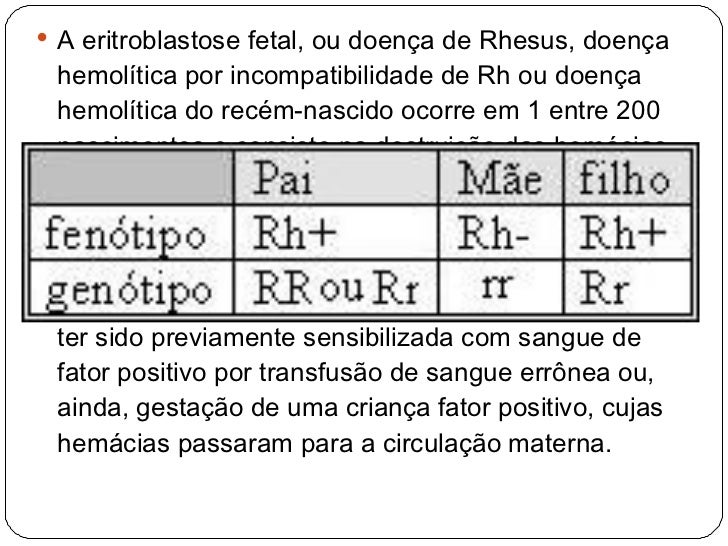 16. 16.  A eritroblastose fetal, ou doença de Rhesus, doença hemolítica por incompatibilidade de Rh ou doença hemolítica do recém-nascido ocorre em 1 entre 200 nascimentos e consiste na destruição das hemácias do feto de Rh+ pelos anticorpos de mãe Rhֿ. Para que exista risco de uma mãe de fator negativo dar a luz a uma criança Rh+ com a doença, deverá ter sido previamente sensibilizada com sangue de fator positivo por transfusão de sangue errônea ou, ainda, gestação de uma criança fator positivo, cujas hemácias passaram para a circulação materna.