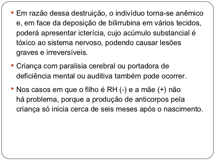 17. 17.  Em razão dessa destruição, o indivíduo torna-se anêmico e, em face da deposição de bilirrubina em vários tecidos, poderá apresentar icterícia, cujo acúmulo substancial é tóxico ao sistema nervoso, podendo causar lesões graves e irreversíveis. Criança com paralisia cerebral ou portadora de deficiência mental ou auditiva também pode ocorrer. Nos casos em que o filho é RH (-) e a mãe (+) não há problema, porque a produção de anticorpos pela criança só inicia cerca de seis meses após o nascimento.