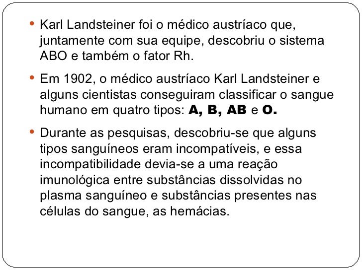 2. 2.  Karl Landsteiner foi o médico austríaco que, juntamente com sua equipe, descobriu o sistema ABO e também o fator Rh. Em 1902, o médico austríaco Karl Landsteiner e alguns cientistas conseguiram classificar o sangue humano em quatro tipos: A, B, AB e O.  Durante as pesquisas, descobriu-se que alguns tipos sanguíneos eram incompatíveis, e essa incompatibilidade devia-se a uma reação imunológica entre substâncias dissolvidas no plasma sanguíneo e substâncias presentes nas células do sangue, as hemácias.