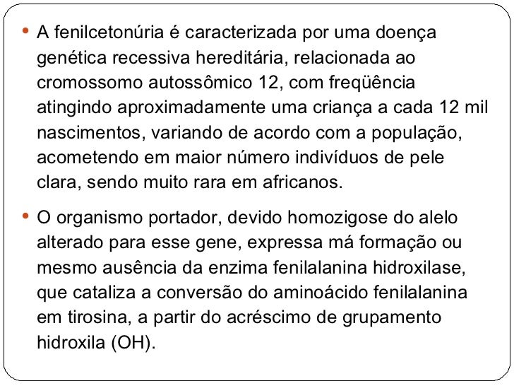 20. 20.  A fenilcetonúria é caracterizada por uma doença genética recessiva hereditária, relacionada ao cromossomo autossômico 12, com freqüência atingindo aproximadamente uma criança a cada 12 mil nascimentos, variando de acordo com a população, acometendo em maior número indivíduos de pele clara, sendo muito rara em africanos.  O organismo portador, devido homozigose do alelo alterado para esse gene, expressa má formação ou mesmo ausência da enzima fenilalanina hidroxilase, que cataliza a conversão do aminoácido fenilalanina em tirosina, a partir do acréscimo de grupamento hidroxila (OH).