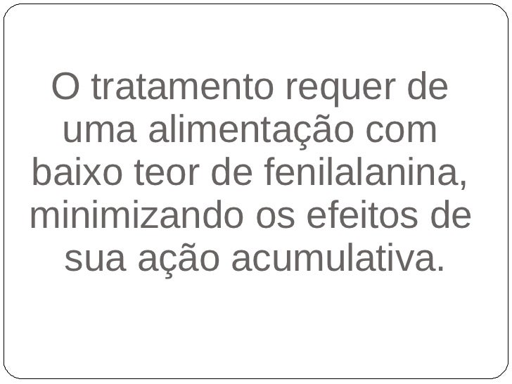 22. 22. O tratamento requer de uma alimentação combaixo teor de fenilalanina,minimizando os efeitos de sua ação acumulativa.