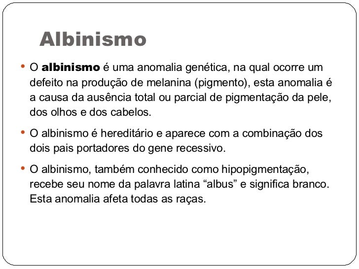 23. 23. Albinismo O albinismo é uma anomalia genética, na qual ocorre um defeito na produção de melanina (pigmento), esta anomalia é a causa da ausência total ou parcial de pigmentação da pele, dos olhos e dos cabelos. O albinismo é hereditário e aparece com a combinação dos dois pais portadores do gene recessivo. O albinismo, também conhecido como hipopigmentação, recebe seu nome da palavra latina “albus” e significa branco. Esta anomalia afeta todas as raças.