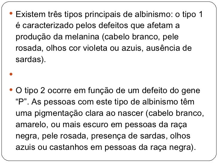 24. 24.  Existem três tipos principais de albinismo: o tipo 1 é caracterizado pelos defeitos que afetam a produção da melanina (cabelo branco, pele rosada, olhos cor violeta ou azuis, ausência de sardas). O tipo 2 ocorre em função de um defeito do gene “P”. As pessoas com este tipo de albinismo têm uma pigmentação clara ao nascer (cabelo branco, amarelo, ou mais escuro em pessoas da raça negra, pele rosada, presença de sardas, olhos azuis ou castanhos em pessoas da raça negra).