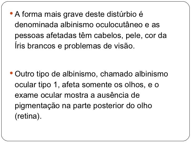25. 25.  A forma mais grave deste distúrbio é denominada albinismo oculocutâneo e as pessoas afetadas têm cabelos, pele, cor da Íris brancos e problemas de visão. Outro tipo de albinismo, chamado albinismo ocular tipo 1, afeta somente os olhos, e o exame ocular mostra a ausência de pigmentação na parte posterior do olho (retina).
