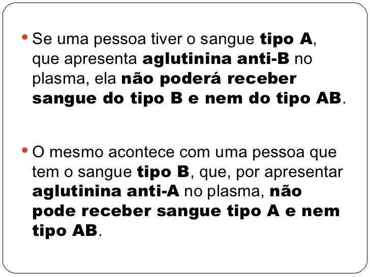 6. 6.  Se uma pessoa tiver o sangue tipo A, que apresenta aglutinina anti-B no plasma, ela não poderá receber sangue do tipo B e nem do tipo AB. O mesmo acontece com uma pessoa que tem o sangue tipo B, que, por apresentar aglutinina anti-A no plasma, não pode receber sangue tipo A e nem tipo AB.