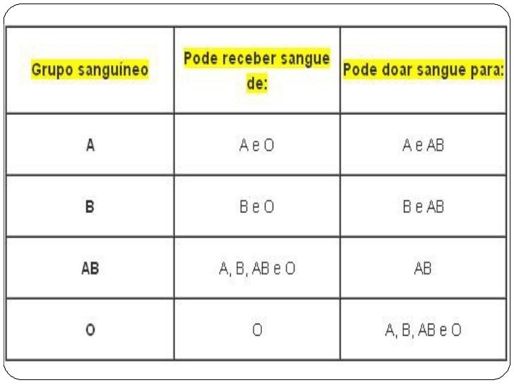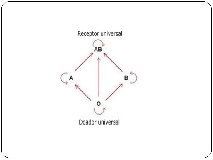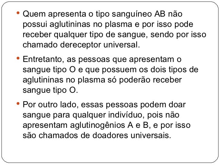 7. 7.  Quem apresenta o tipo sanguíneo AB não possui aglutininas no plasma e por isso pode receber qualquer tipo de sangue, sendo por isso chamado dereceptor universal. Entretanto, as pessoas que apresentam o sangue tipo O e que possuem os dois tipos de aglutininas no plasma só poderão receber sangue tipo O. Por outro lado, essas pessoas podem doar sangue para qualquer indivíduo, pois não apresentam aglutinogênios A e B, e por isso são chamados de doadores universais.