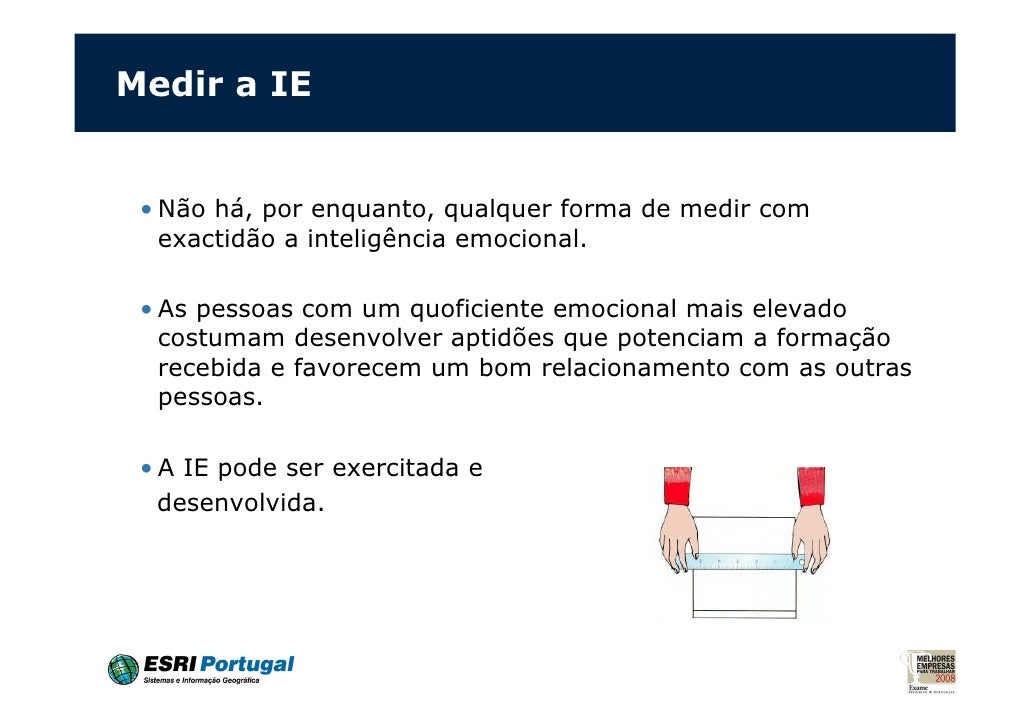 10. 10. Medir a IE • Não há, por enquanto, qualquer forma de medir com exactidão a inteligência emocional. • As pessoas com um quoficiente emocional mais elevado costumam desenvolver aptidões que potenciam a formação recebida e favorecem um bom relacionamento com as outras pessoas. • A IE pode ser exercitada e desenvolvida.