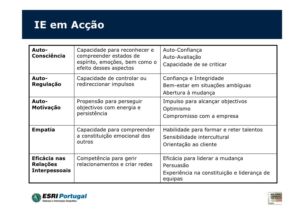 12. 12. IE em AcçãoAuto- Capacidade para reconhecer e Auto-ConfiançaConsciência compreender estados de Auto-Avaliação espírito, emoções, bem como o Capacidade de se criticar efeito desses aspectosAuto- Capacidade de controlar ou Confiança e IntegridadeRegulação redireccionar impulsos Bem-estar em situações ambíguas Abertura à mudançaAuto- Propensão para perseguir Impulso para alcançar objectivosMotivação objectivos com energia e Optimismo persistência Compromisso com a empresaEmpatia Capacidade para compreender Habilidade para formar e reter talentos a constituição emocional dos Sensibilidade intercultural outros Orientação ao clienteEficácia nas Competência para gerir Eficácia para liderar a mudançaRelações relacionamentos e criar redes PersuasãoInterpessoais Experiência na constituição e liderança de equipas
