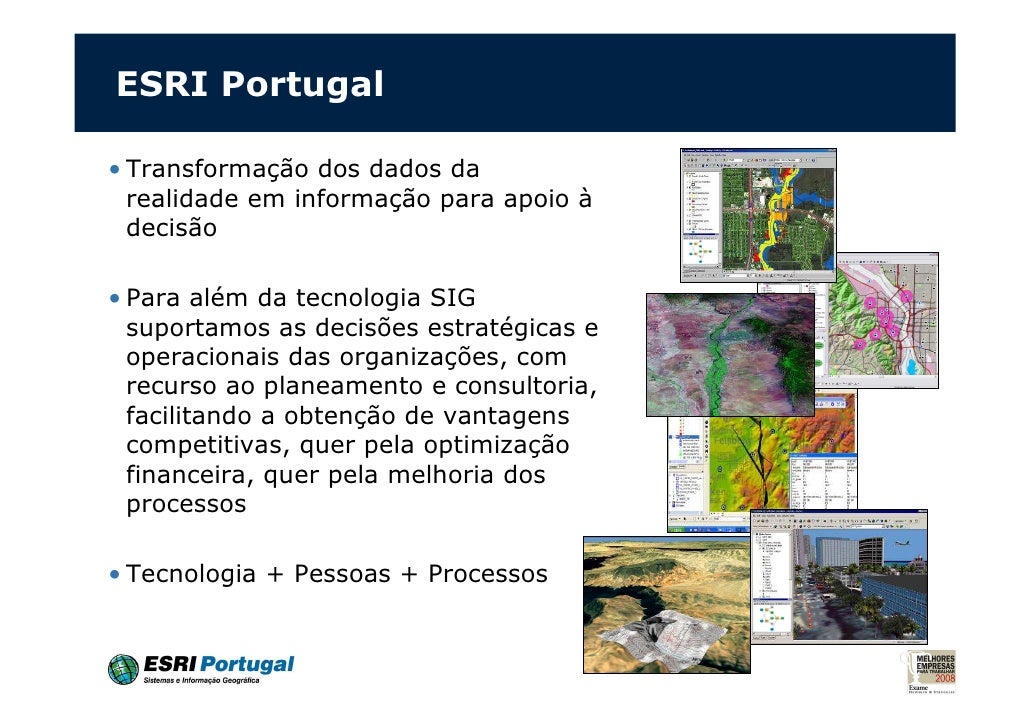 16. 16. ESRI Portugal• Transformação dos dados da realidade em informação para apoio à decisão• Para além da tecnologia SIG suportamos as decisões estratégicas e operacionais das organizações, com recurso ao planeamento e consultoria, facilitando a obtenção de vantagens competitivas, quer pela optimização financeira, quer pela melhoria dos processos• Tecnologia + Pessoas + Processos