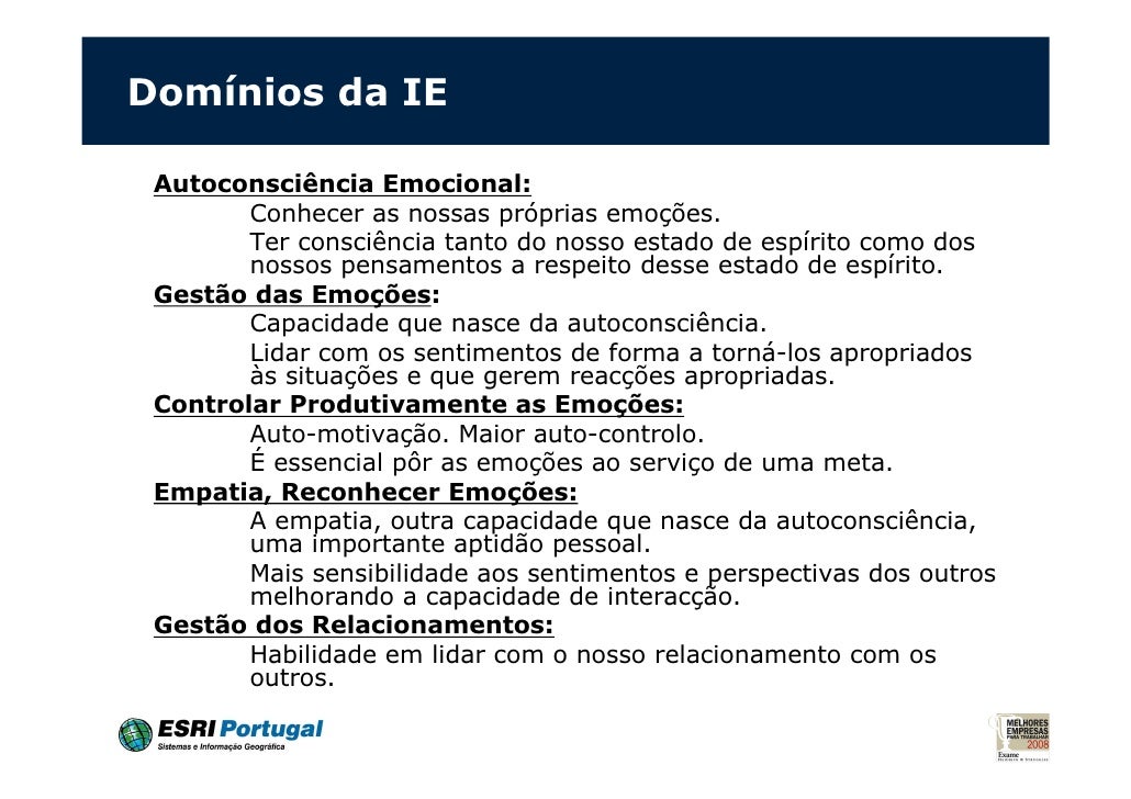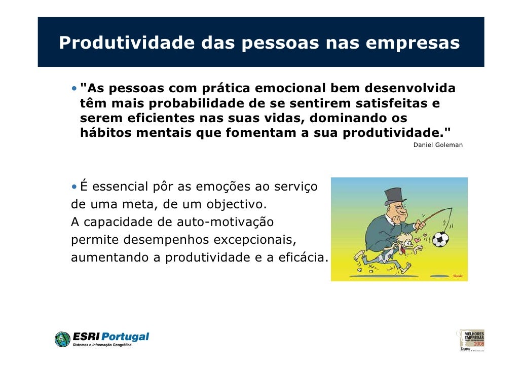 17. 17. Produtividade das pessoas nas empresas • "As pessoas com prática emocional bem desenvolvida têm mais probabilidade de se sentirem satisfeitas e serem eficientes nas suas vidas, dominando os hábitos mentais que fomentam a sua produtividade." Daniel Goleman • É essencial pôr as emoções ao serviço de uma meta, de um objectivo. A capacidade de auto-motivação permite desempenhos excepcionais, aumentando a produtividade e a eficácia.